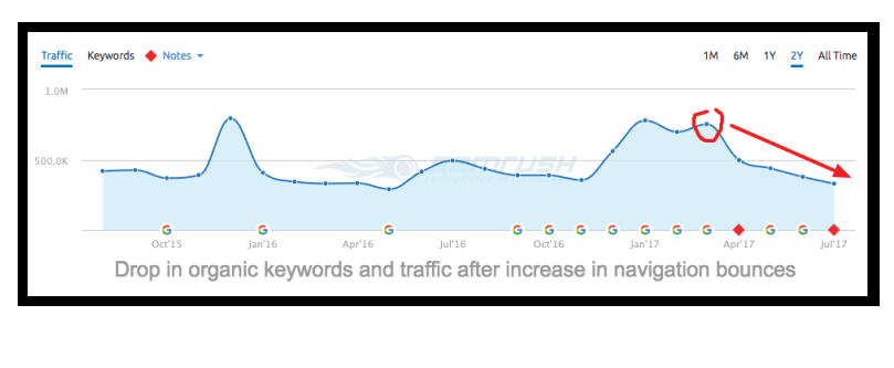 For this publisher, the substantial increase in navigation bounces was directly correlated to: