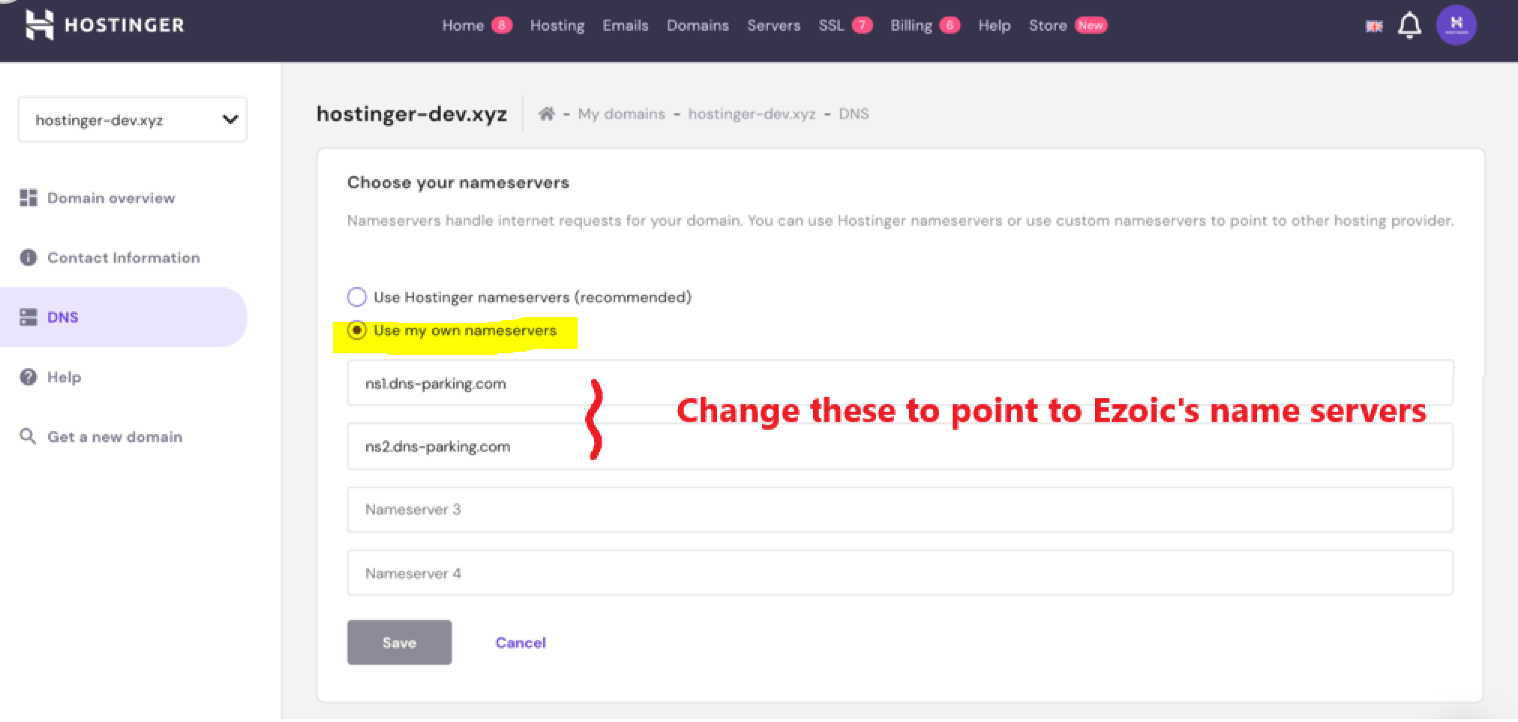 6. Cambia los servidores de nombres de tu hosting por los servidores de nombres correspondientes de Ezoic y haz clic en "Guardar".