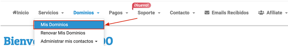3. Aquí verás el menú con diferentes opciones. Coloca el puntero sobre Dominios y haz clic en Mis Dominios.