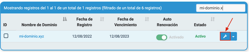 4. Aquí puedes ver la lista de tus dominios activos, cancelados y expirados. Hay dos maneras de gestionar un dominio: