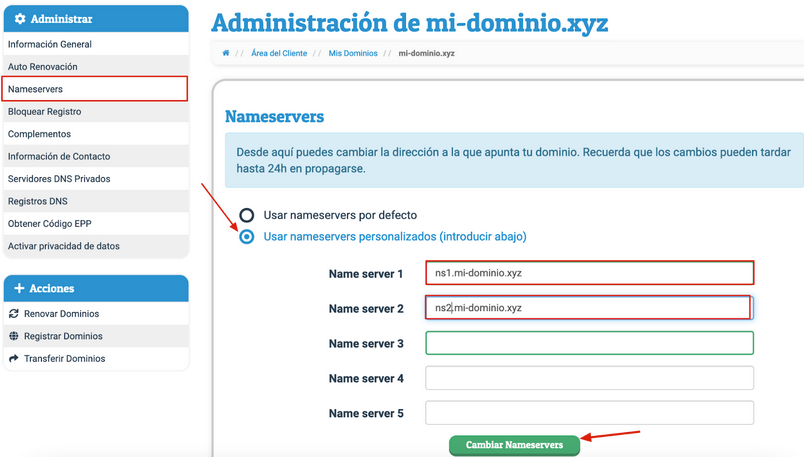 5. En esta sección, verás diferentes opciones. Para gestionar el DNS, haz clic en Servidores de Nombres