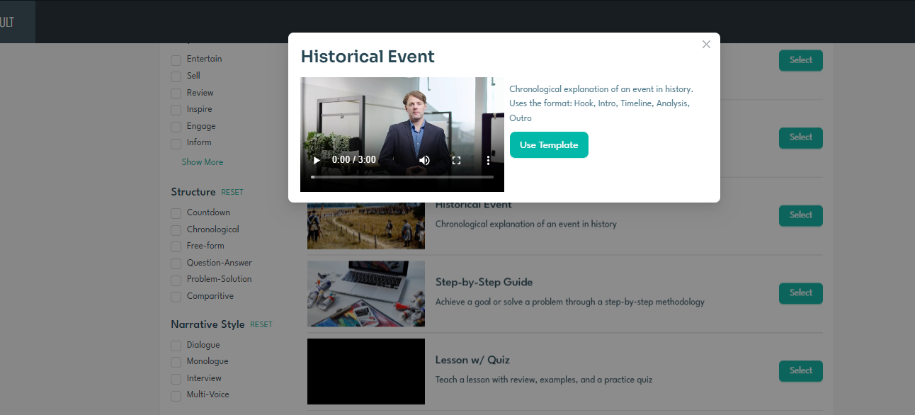 • Click 'select' on a template to view a sample video created with that template. This is to help show how your video would be structured if you select that template. After reviewing the sample video, you can click "Use Template" to proceed with that template, or select a different template.