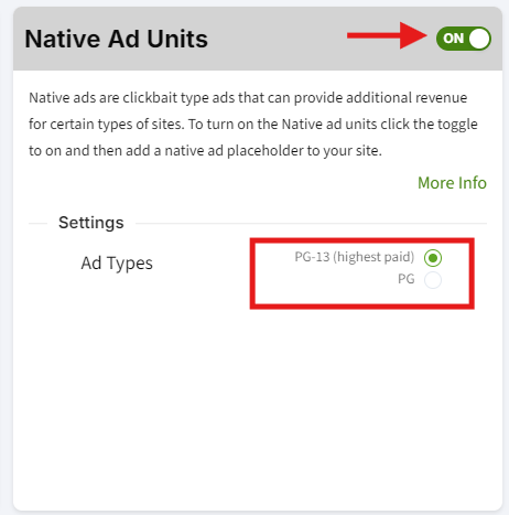 Los anuncios nativos y las unidades de enlaces pueden funcionar bien en algunos sitios web. Recomendamos crear y colocar 1-2 marcadores nativos en cada página. Al hacer esto, podría aumentar sus ingresos en un 10-25% dependiendo del sitio. Se pueden habilitar anuncios nativos a través de Ezoic Ads en su panel de control > Tipos de Anuncios > Anuncios Nativos > active el interruptor deslizante. También puede elegir la clasificación de los anuncios nativos para ser PG o PG-13:
