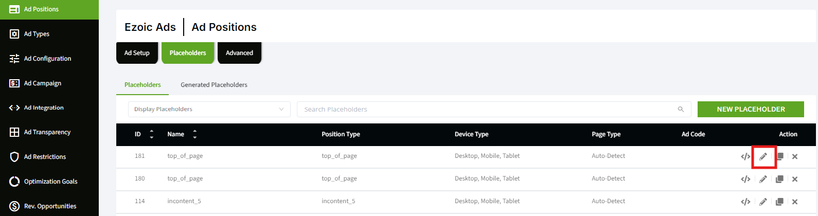 Qui sotto c'è un esempio di come compariranno quando elencati nell'app Ezoic Ads nel tuo cruscotto:
