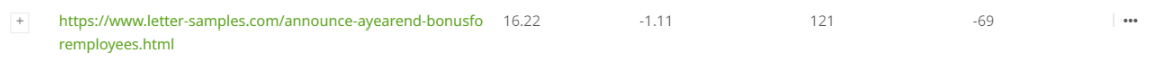 - Click the plus sign (+) next to a URL to see suggested keywords that can help recover lost traffic. For each keyword suggested, the change in traffic and in rank are displayed.