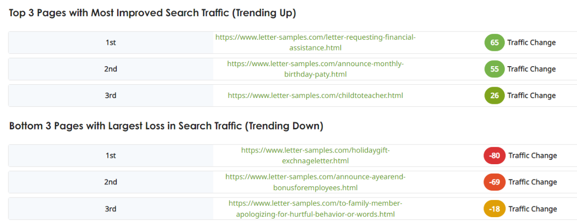 - The overview includes the top three pages with search traffic trending up and the bottom three pages with search traffic trending down.