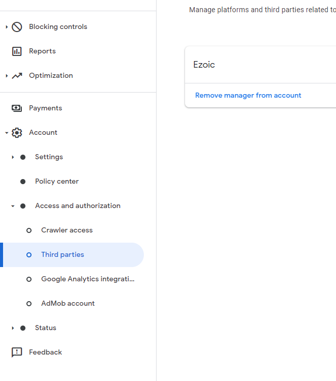 3. You should see a section that says Ezoic. Click the blue "Remove manager from account" link