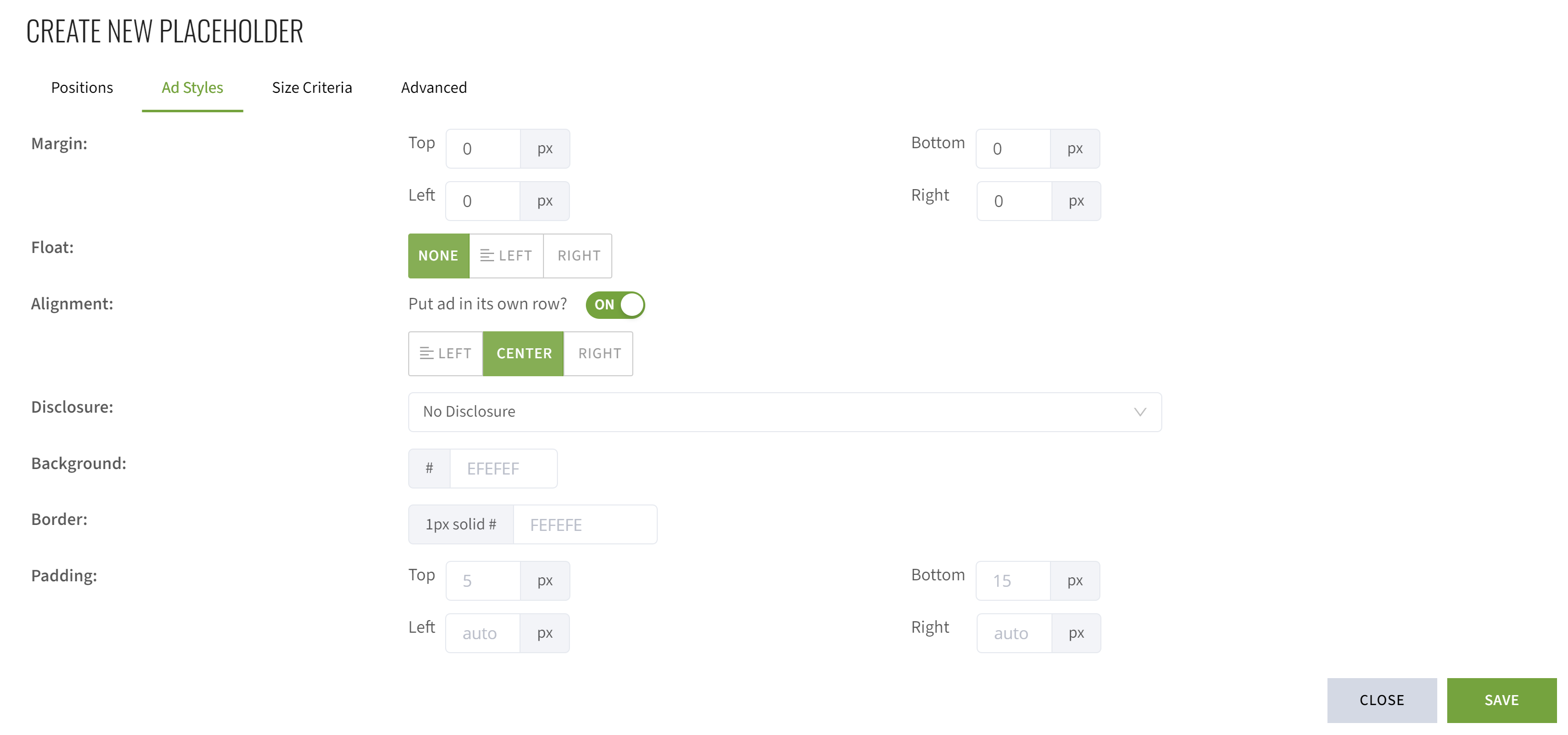 6. For more settings options, click the green 'Advanced' button to bring up a new panel with three additional tabs. The 'Ad Styles' tab allows you to customize margins, floating alignment, padding, and other features.