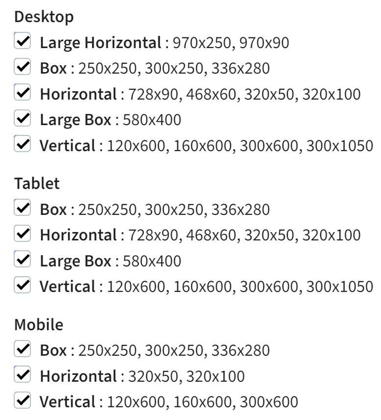5. Enable possible sizes for the placeholder for each device. The Ezoic-recommended sizes will already be enabled. It's important to include as many sizes that fit in that location as possible.