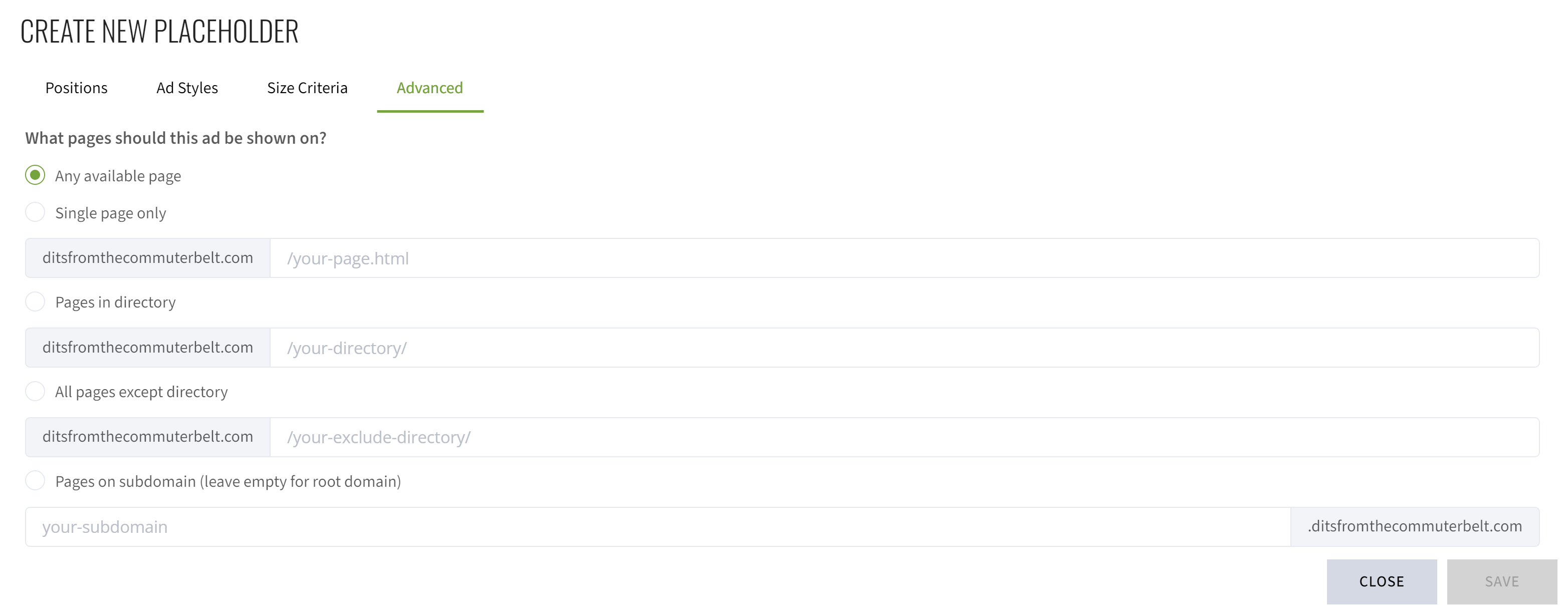 8. The 'Advanced' tab allows you to designate specific pages for the placeholder to appear on or allow EzoicAds automatically reproduce it across similar pages on your site.