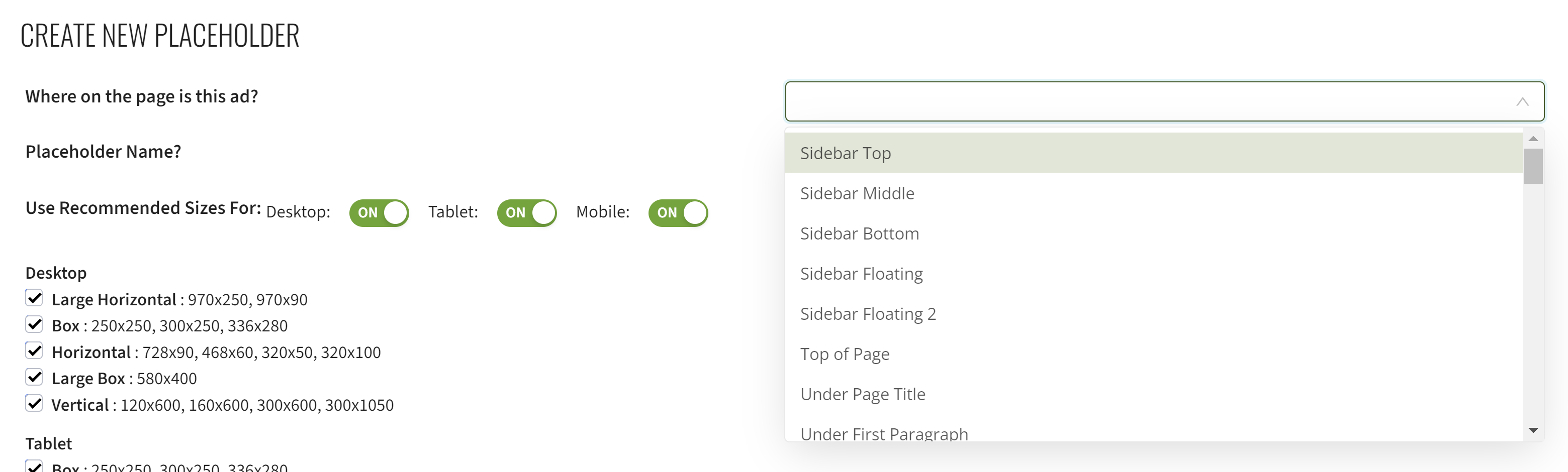 • Solution: Verify that you have selected the correct position type for each placeholder (e.g., Sidebar, Top of Page, Mid Content, etc.). Proper naming and accurate positioning help the system understand where to place the ads relative to your page content.