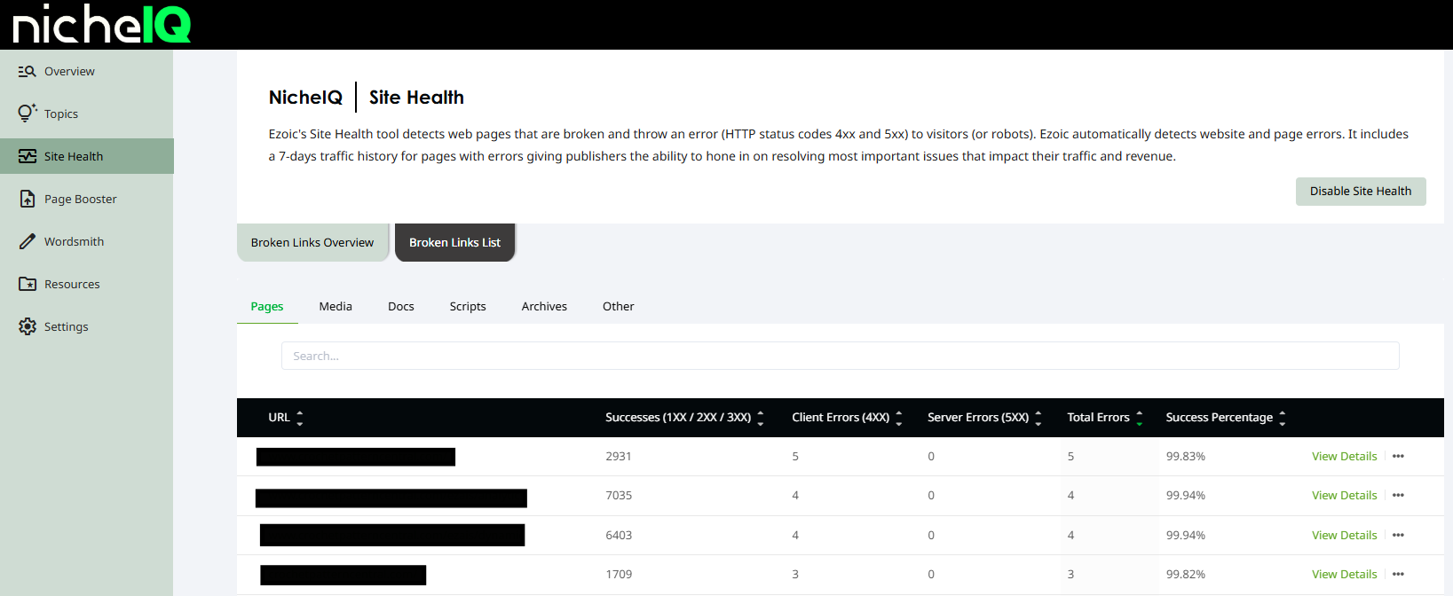 The Broken Links tool from NicheIQ automatically detects website and page errors that occurred in the last 7 days. This tool helps users identify and resolve issues that negatively impact traffic and revenue. By understanding the nature of these errors and their frequency, users can take corrective actions to improve the user experience on their websites.