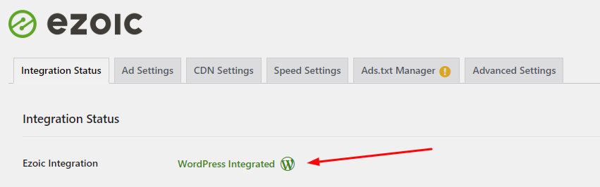 6. Klicken Sie innerhalb des Plugins auf den Tab "Integrationsstatus" und überprüfen Sie, ob die Ezoic-Integration den Status "WordPress integriert" hat.