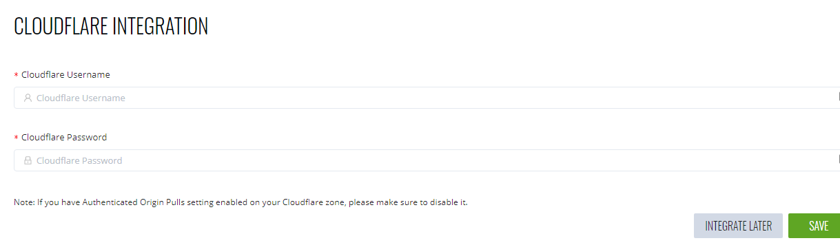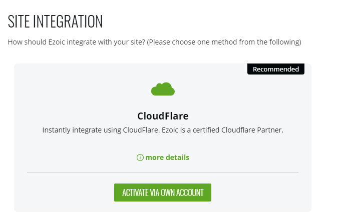 2. Wählen Sie die Option „Cloudflare-Integration“ und klicken Sie auf die grüne Schaltfläche „Über eigenes Konto aktivieren“