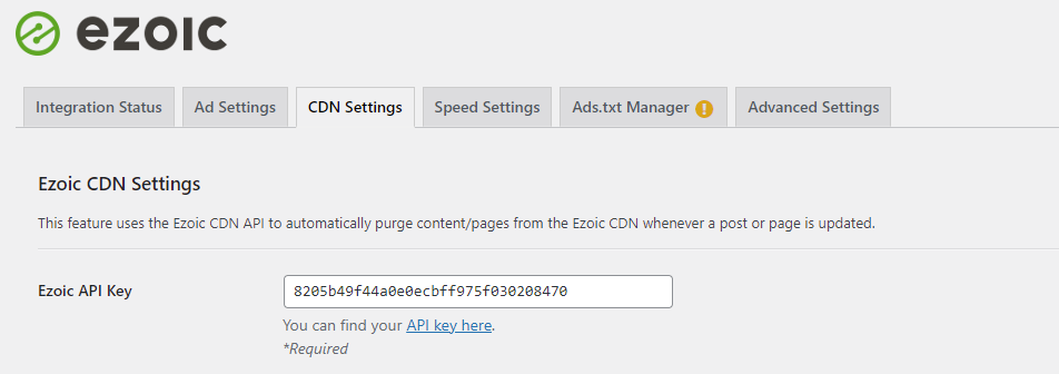 5. Kopieren Sie den generierten API-Schlüssel. Gehen Sie zum Ezoic-Plugin in WordPress. Gehen Sie zum "CDN-Einstellungen"-Tab. Fügen Sie den API-Schlüssel im Feld "Ezoic API-Schlüssel" ein und klicken Sie auf "Einstellungen speichern".