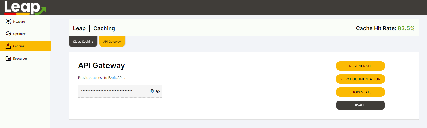 4. Unabhängig davon, ob Sie die Verbindung über Nameserver oder Cloudflare herstellen, wird die Einrichtung Ihres API-Schlüssels dringend empfohlen. Sie finden den Ezoic API-Schlüssel, indem Sie zu "Leap", dann "Caching", dann "API-Gateway" gehen.
