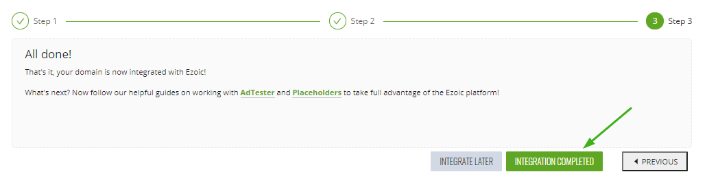 Sie können davon ausgehen, dass die Integration abgeschlossen ist, und mit der Konfiguration von Ezoic fortfahren.