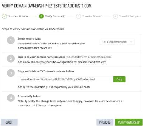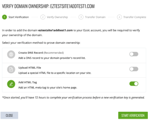 - A modal will pop up to start the verification process. You will be given three options to verify ownership of the domain: