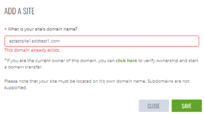- When attempting to add a domain that already exists in another account to your account, you will be presented with this message: