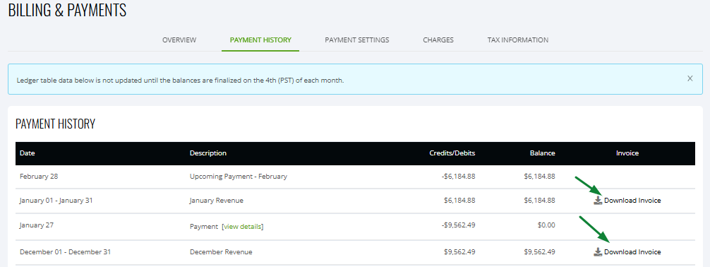 To access the Payment History page, click on the Account Icon located in the top right corner of your Dashboard. Then navigate to Billing & Payments > Payment History. You will find detailed records of your ad revenue for each month.