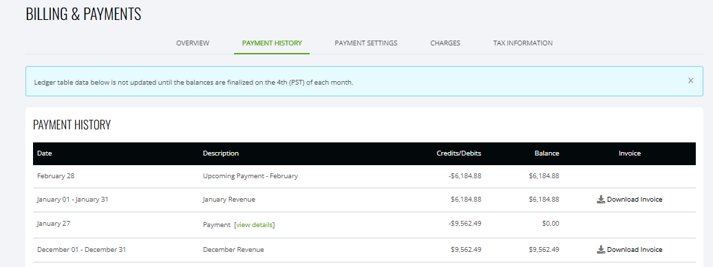 Ad esempio, se ti unisci a dicembre, dovresti aspettarti di essere pagato a fine gennaio per le entrate di dicembre. Usando l'immagine sottostante come esempio, puoi vedere che sono stati guadagnati $9,562.49 a dicembre 2024 (colonna crediti). Questo è stato poi pagato a fine febbraio al publisher (colonna addebiti). Poi $6,184.88 sono stati guadagnati a gennaio 2025, da pagare a fine febbraio 2025.