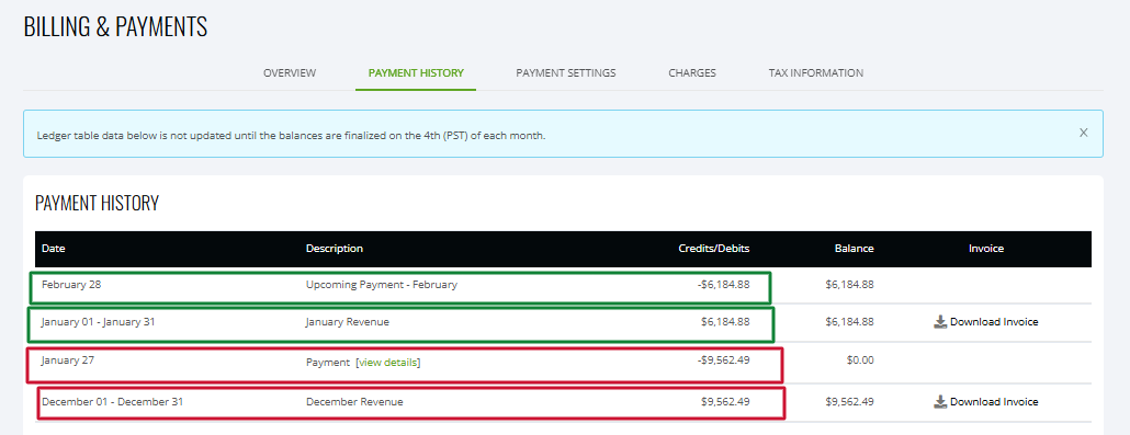 Par exemple, si vous rejoignez en décembre, vous devriez vous attendre à être payé à la fin de janvier pour les revenus de décembre. En utilisant la capture d'écran ci-dessous comme exemple, vous pouvez voir que 9 562,49 $ ont été gagnés en décembre 2024 (colonne des crédits). Cela a ensuite été versé à la fin de février à l'éditeur (colonne des débits). Puis 6 184,88 $ ont été gagnés en janvier 2025, à verser à la fin de février 2025.