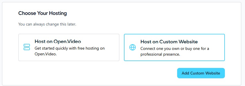 Wenn Sie lieber Ihre eigene Domain nutzen möchten, ermöglicht Ihnen Open.Video den Anschluss einer bereits vorhandenen Website oder den Kauf einer neuen. Dies gibt Ihnen die volle Kontrolle über das Branding Ihrer Kanal-URL.
