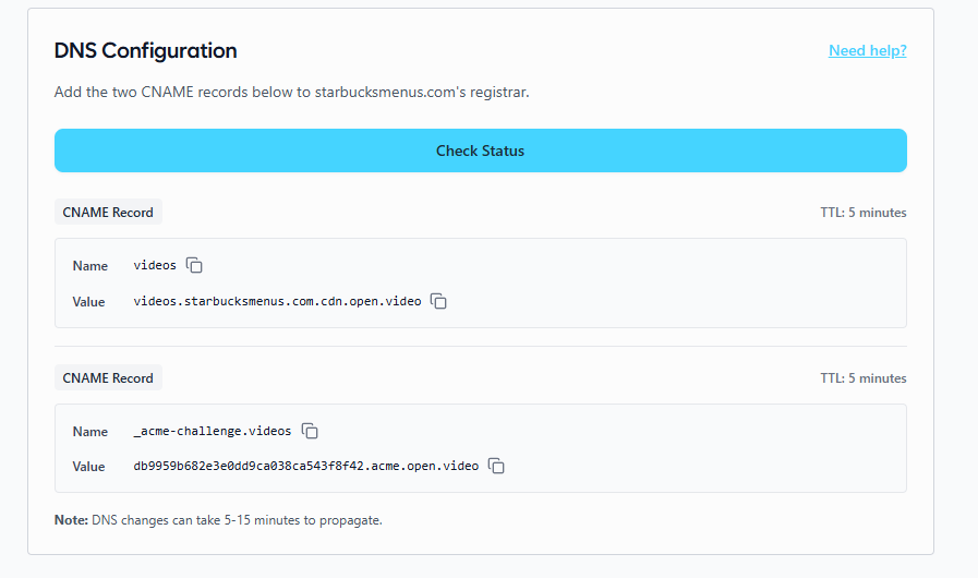 Fügen Sie zwei von Open.Video bereitgestellte CNAME-Einträge bei Ihrem Domain-Registrar hinzu