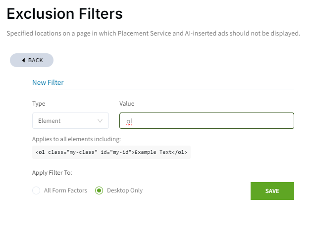 Seleziona Classe, ID o Elemento sotto Filtri di Esclusione. Quindi inserisci la classe, ID o elemento pertinente. Puoi anche scegliere se desideri che il filtro si applichi a tutti i formati (desktop, mobile, tablet) o solo al desktop.