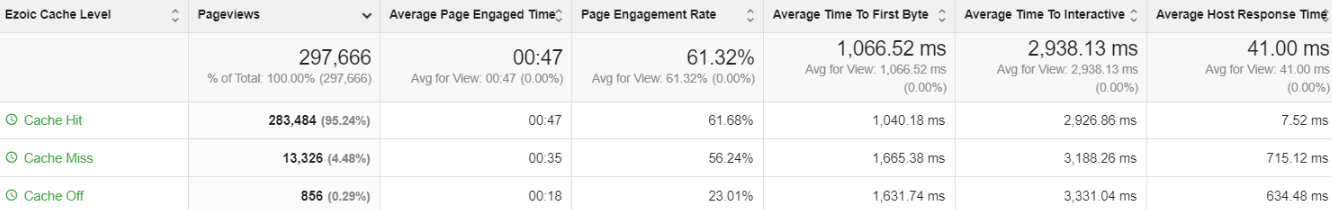 Ad esempio, quando il CDN di Ezoic restituisce 95 "cache hit" e 5 "cache miss", il tasso di cache hit sarebbe del 95%.