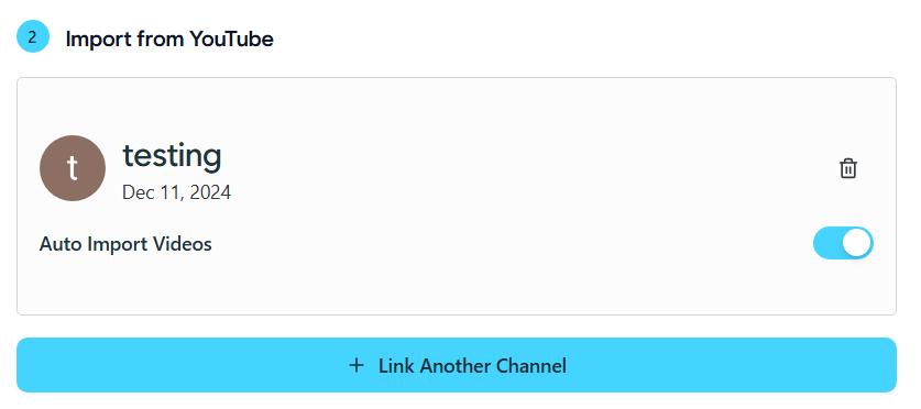 For seamless video importing, we recommend toggling on ‘Auto Import Videos’ - which will import all previously published YouTube videos and future uploads, without any manual action from your end.