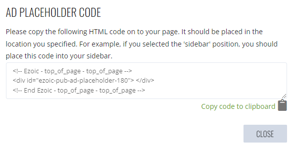 • Fai clic su Salva per generare il codice segnaposto di Ezoic.