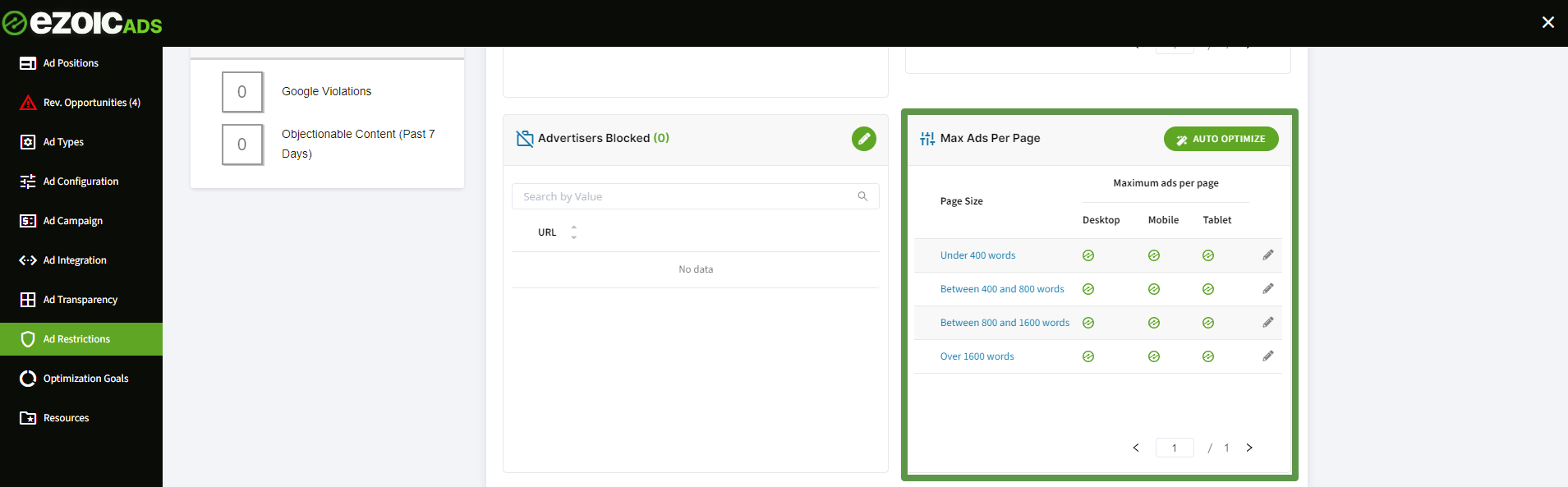 Il sistema di Ezoic è progettato per garantire che il numero di annunci visualizzati sul tuo sito sia in linea con le tue preferenze e le politiche di Google. Puoi controllarlo tramite l'app Annunci Massimi per Pagina che si trova sotto EzoicAds > Restrizioni Annunci.