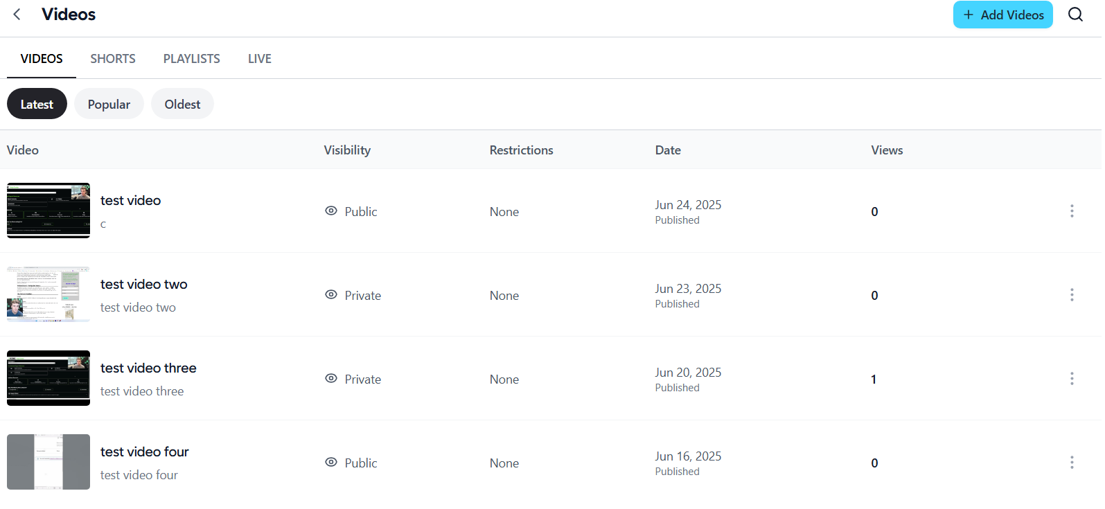 You can also see the visibility status, restrictions applied, upload date and number of views for each video.