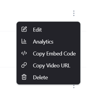 Per gestire video individuali o brevi, fai clic sull'icona del menu a destra della pagina. Questo ti consente di modificare il video, visualizzare le analisi, copiare il codice di incorporamento del video, copiare l'URL del video e eliminare il video.