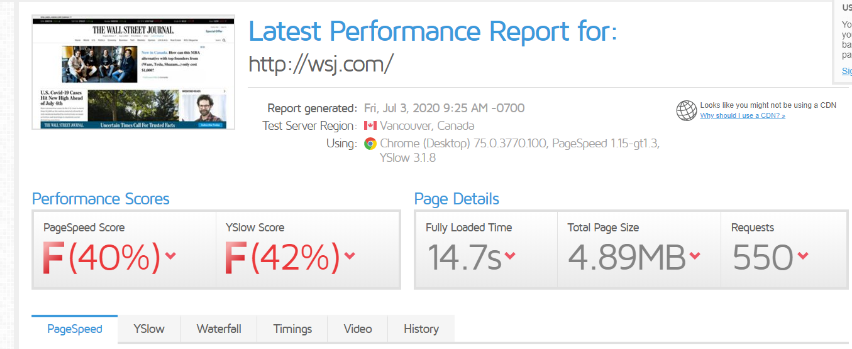Furthermore, many recommendations provided by tools like GTMetrix are checklist-based and do not consider the context or relevance to actual site speed or performance. These tools often miss the point that user experience is more critical than achieving a perfect site speed score. For instance, well-known sites like The Wall Street Journal may receive poor scores from such tools despite delivering a satisfactory user experience.