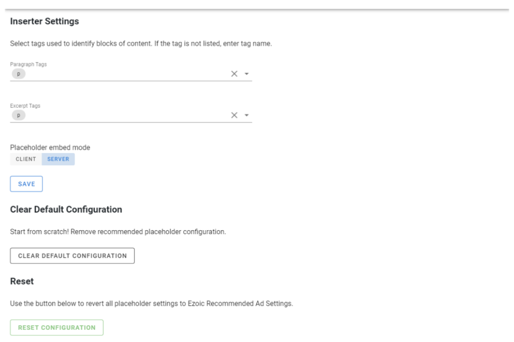 - Utiliza el botón “Restablecer configuración” para borrar todas las configuraciones de emplazamiento y restaurar las configuraciones recomendadas por Ezoic.