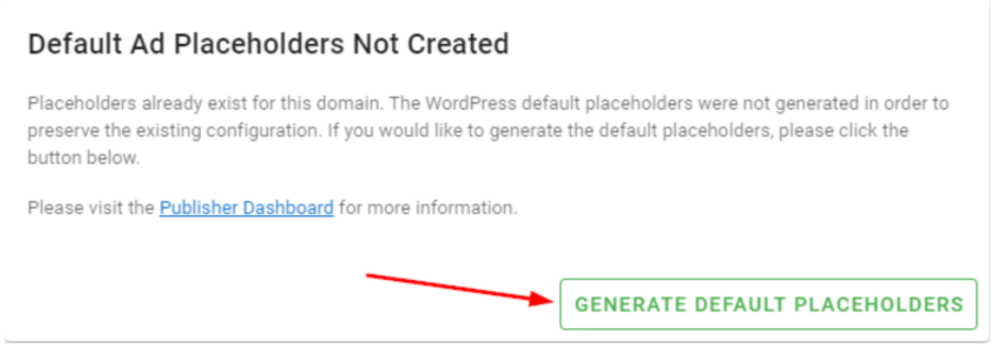 - Si ya tienes contenedores creados a través de la extensión de Chrome de Ezoic o el panel de control del publicador, los contenedores predeterminados de WordPress no se crearán automáticamente. Para generarlos, haz clic en el botón "Generar contenedores predeterminados" en la página de Ad Settings.