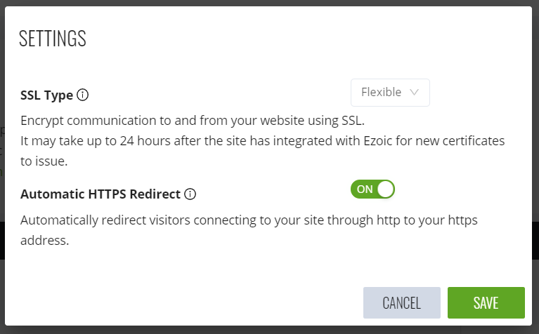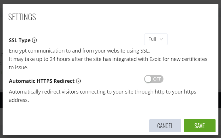 - If there is no automatic redirect to HTTPS at the host server, enable this setting in the Ezoic dashboard. Be cautious to avoid enabling it if there's already an automatic redirect at the host server to prevent site issues.