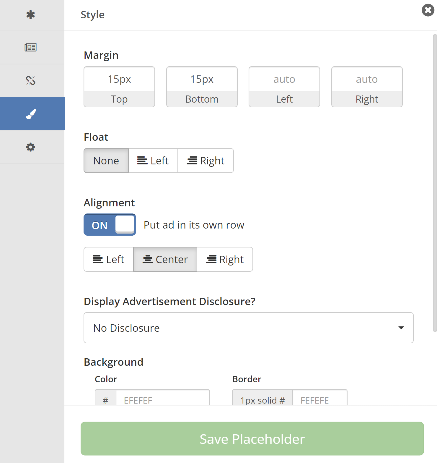 • Style Tab: Customize the placeholder's appearance, including margins, padding, alignment, and background color. You can also decide to display an Advertisement Disclosure or a bordered/colored background to your placeholder