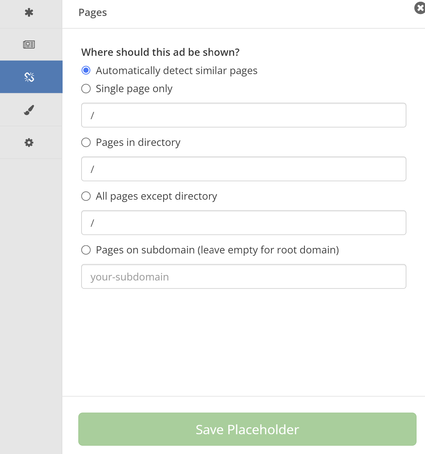 - Seiten-Registerkarte: Bestimmen Sie die Seiten oder Seitentypen, auf denen der Platzhalter angezeigt wird. Sie können wählen, ob Sie ihn auf ähnliche Seiten anwenden oder auf eine einzelne Seite, ein Verzeichnis oder eine Subdomain beschränken möchten.