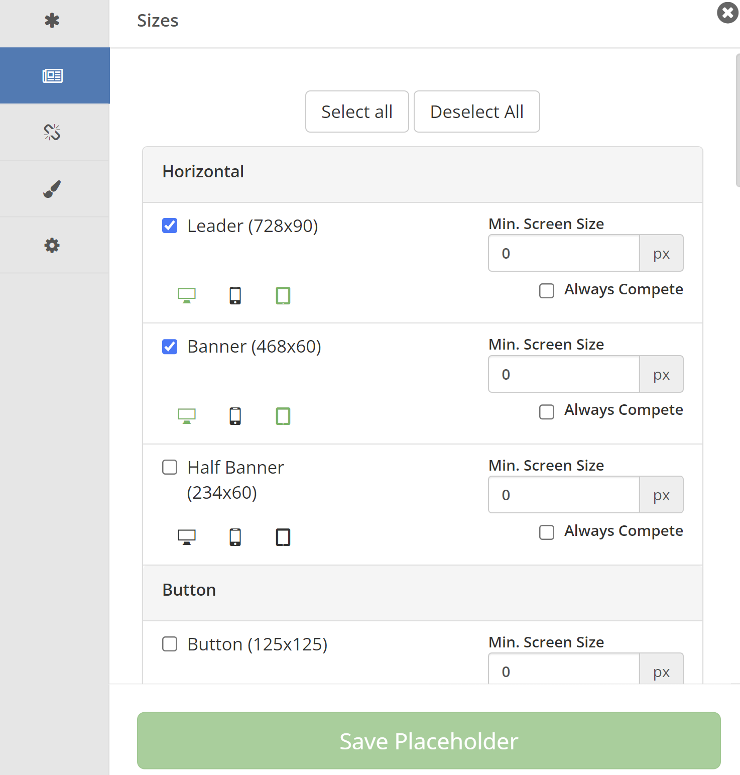 - Größen-Registerkarte: Wählen Sie die Anzeigengrößen aus, die an diesem Ort getestet werden sollen. Verwenden Sie die Option "Alle auswählen", um automatisch alle Größen auszuwählen, die zur Position passen.