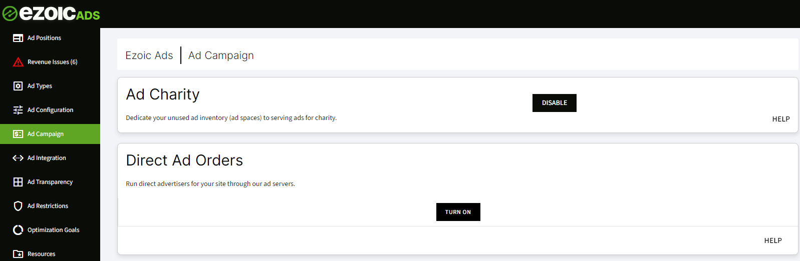 Los anuncios de caridad están activados por defecto para todos los editores para apoyar estos beneficios. Estos anuncios evitan el colapso del espacio en la página, mejorando potencialmente el posicionamiento en los motores de búsqueda al mejorar la puntuación de CWV para CLS. Los editores que prefieren no utilizar esta función pueden desactivarla a través del panel de Ezoic en Ezoic Ads > Ad Campaign. Sin embargo, desactivar esta función puede causar el colapso de los espacios publicitarios, afectando negativamente el posicionamiento en los motores de búsqueda.