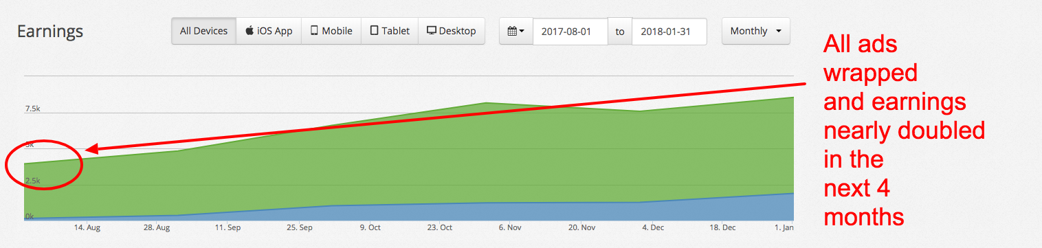 Once they elected to wrap these ads, their revenue roughly doubled in the next 4 months (nearly an additional $2,500 per month). The reason why this publisher saw such a dramatic revenue increase was due to the effect those unwrapped ads were having on all other ads. Once wrapped, Ezoic could better account for the way things like page ad density affected total session revenue and long-term ad value; resulting in fast revenue improvements.