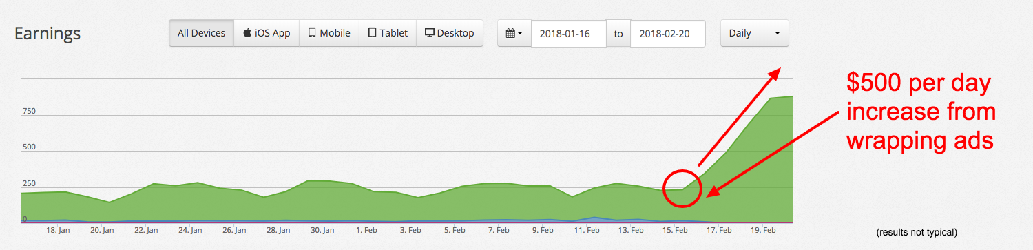 Une fois que toutes les annonces ont été enveloppées sur ce site web, l'EPMV a presque triplé. Cela a entraîné une augmentation des revenus de près de 500 $ par jour.