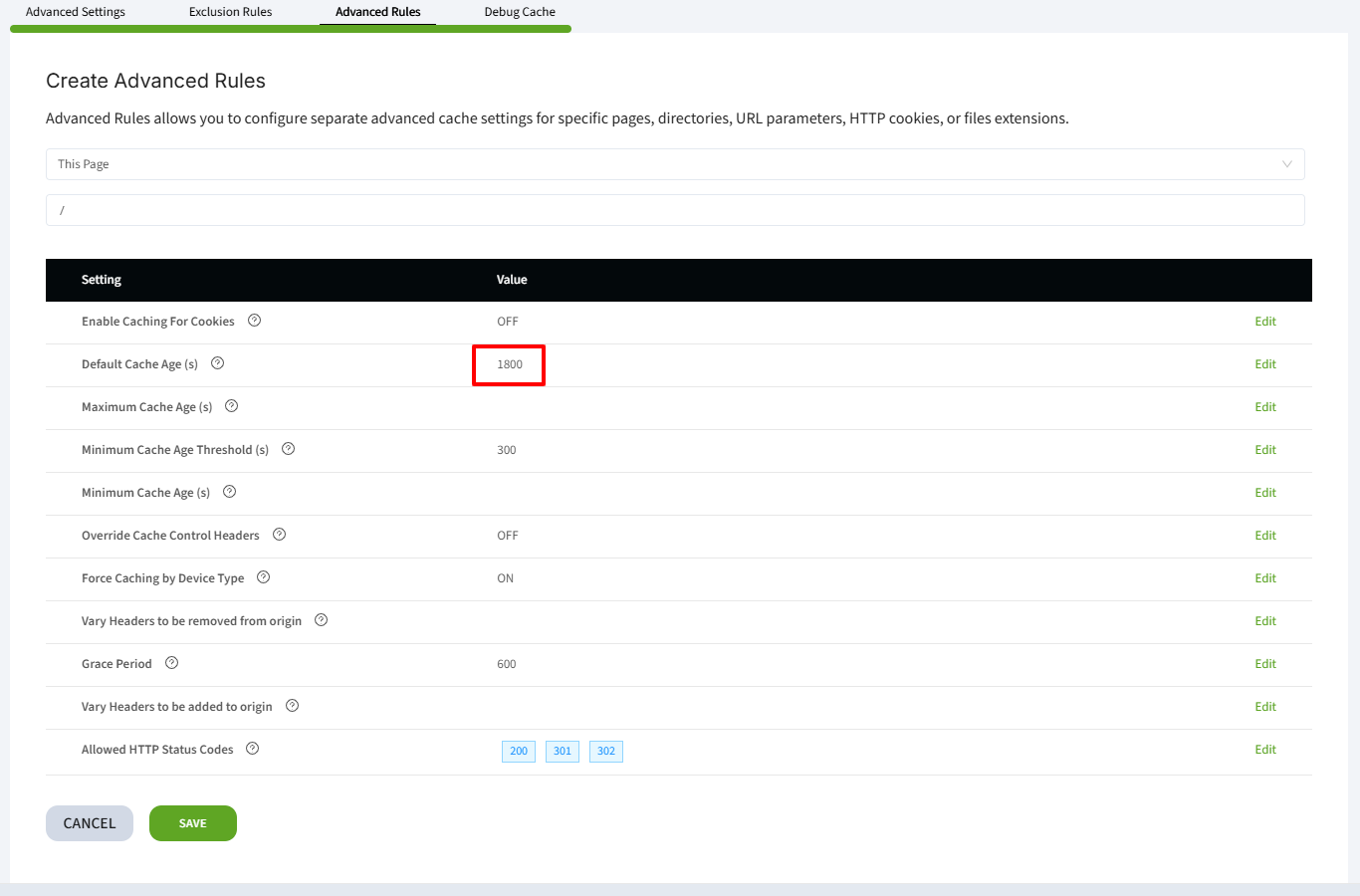 Créez une règle de page ou de répertoire qui réduit l'âge par défaut du cache pour la page ou le répertoire spécifique. Si l'URL est la page d'accueil, cela doit être représenté par une barre oblique (/).